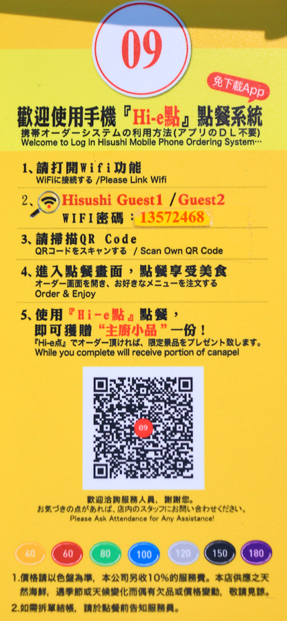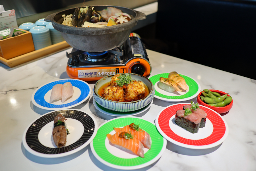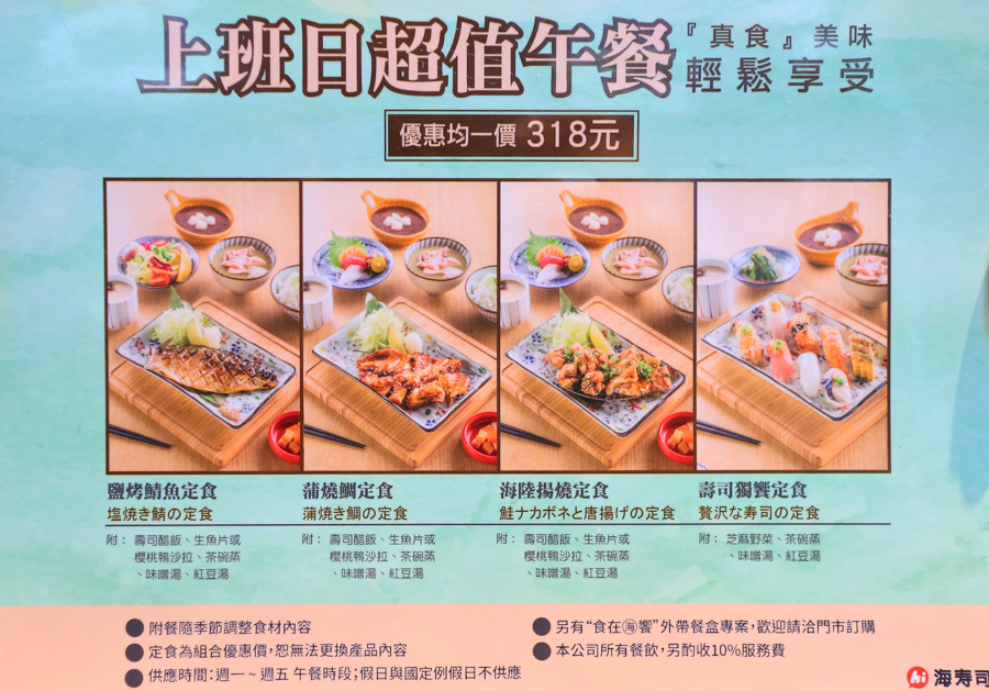 海壽司的品項非常多,握壽司、炙壽司、手捲捲物、湯品、茶碗蒸、烤物、揚物、沙拉、小物、生魚片、軍艦、甜品、酒品、飲品等,價格以色盤計算,另加收10%服務費