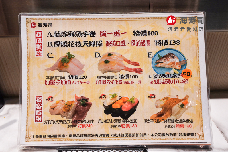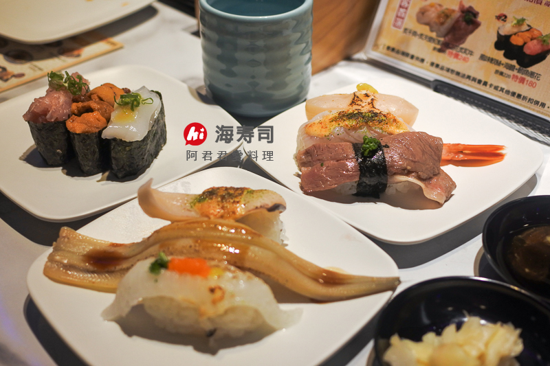 當大家都往新開幕的百貨公司朝聖時,阿君君和熊哥不跟風改往微風松高前進,不為別的,就為了吃每週從日本空運食材來台的海壽司,每次滑手機看到海壽司粉絲團貼文就忍不住口水直流,這次終於有機會一親芳澤!海壽司微風松高店位置在微風松高百貨三樓,靠近捷運藍線市政府站3號出口交通便利,用餐環境舒適明亮,而且吃飽喝足後還可以就近逛逛大血拼,很推薦家人情侶一同來用餐。