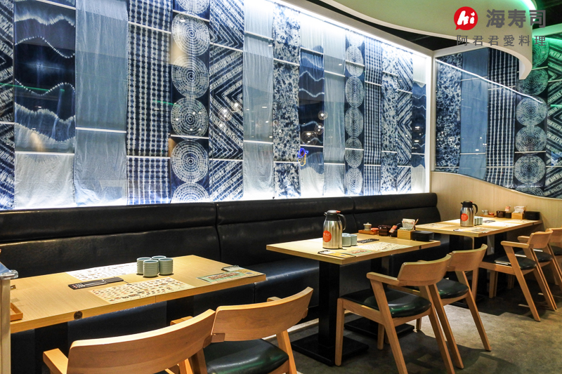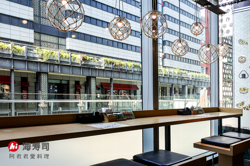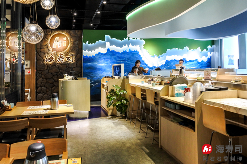 裝潢以波浪狀裝飾再搭配玻璃浮球,藍色牆面透露出海洋氣息,還有還有~大片落地窗讓光線照射進來,讓海壽司不只端上好吃的料理,更營造了舒適的用餐環境,因此從食物到用餐情境隨便手機拿出來都非常好拍!