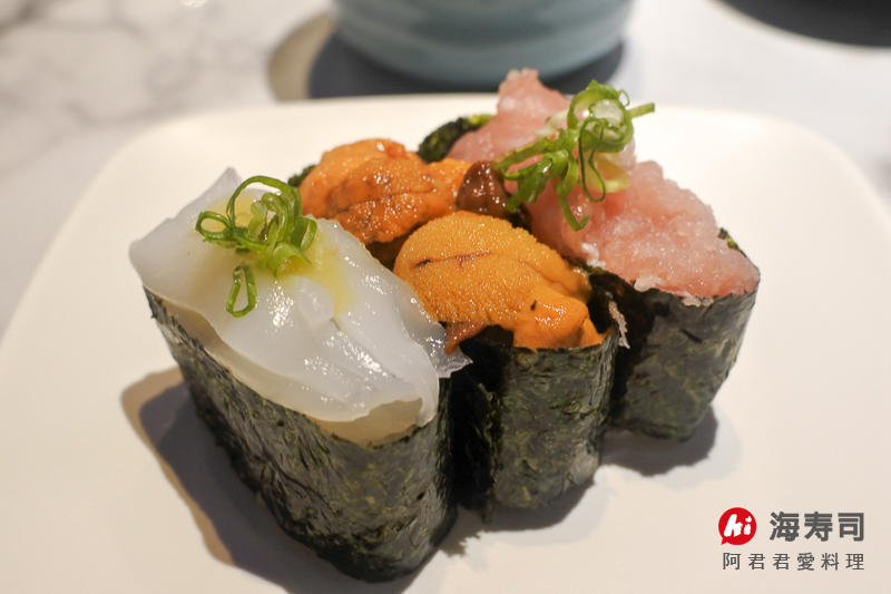 饕客首選TOP2。風味軟絲+海膽+鮪魚蔥花