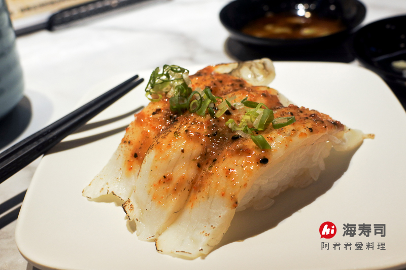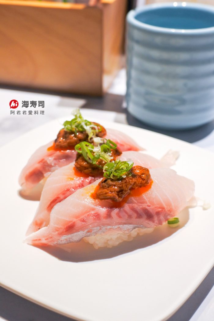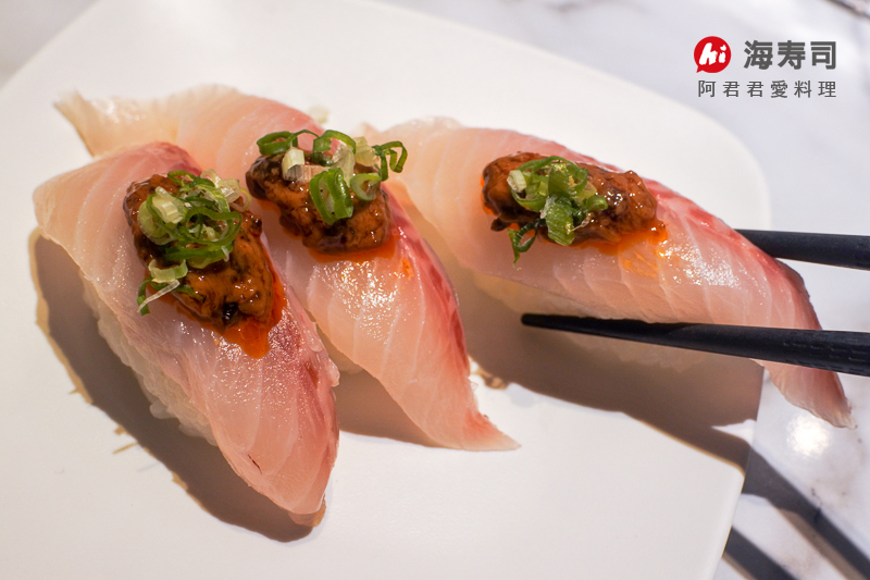 特調辛醬搭配甜美紅甘,點綴蔥花,辛醬的微辣把紅甘甜味凸顯了出來,果然就是要一口氣吃三貫才過癮!