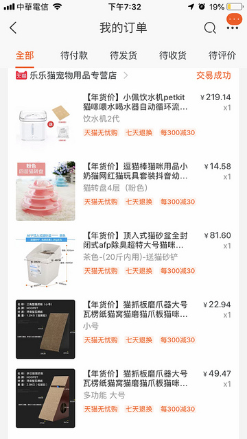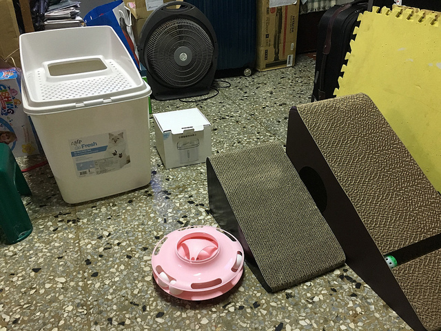 買了兩個貓抓板、一個大型的貓砂專用桶子,還有買了貓咪玩具和電動喝水器。