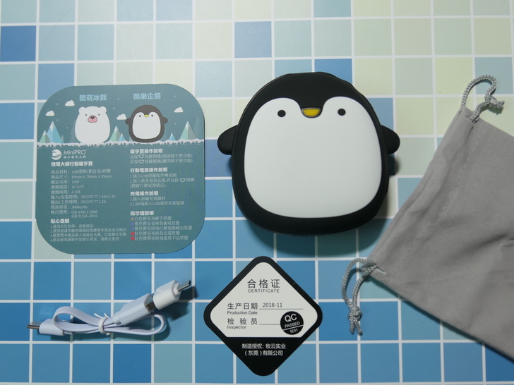 【▼】從包裝盒上可以看見MiniPRO行動暖手寶-酷樂企鵝由ABS塑料/鋁合金/矽膠等材料所組成,產品尺寸為83mm x 78mm x 35mm,約略是一個掌心的大小,有酷萌冰熊與酷樂企鵝兩種款式(P助表示他們好可愛唷,都是台灣監製的唷~),MiniPRO行動暖手寶-酷樂企鵝包裝內容物有本體、使用說明兼保證書、出廠合格證、扁形USB連接線(含轉接頭共21公分)與外出必備的收納袋。而其他重要的規格如下: