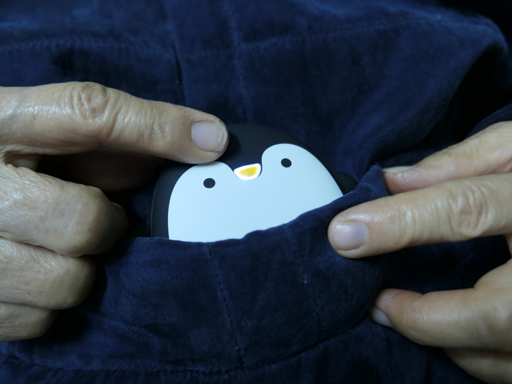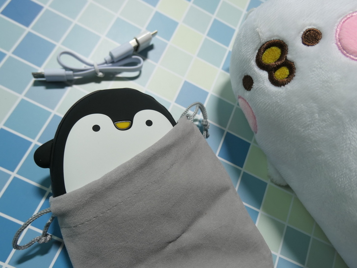 【▼】所附贈的收納包有束口袋,收納袋大小可放入企鵝本體與USB充電線,P助表示:企鵝探出頭的模樣真是可愛!
