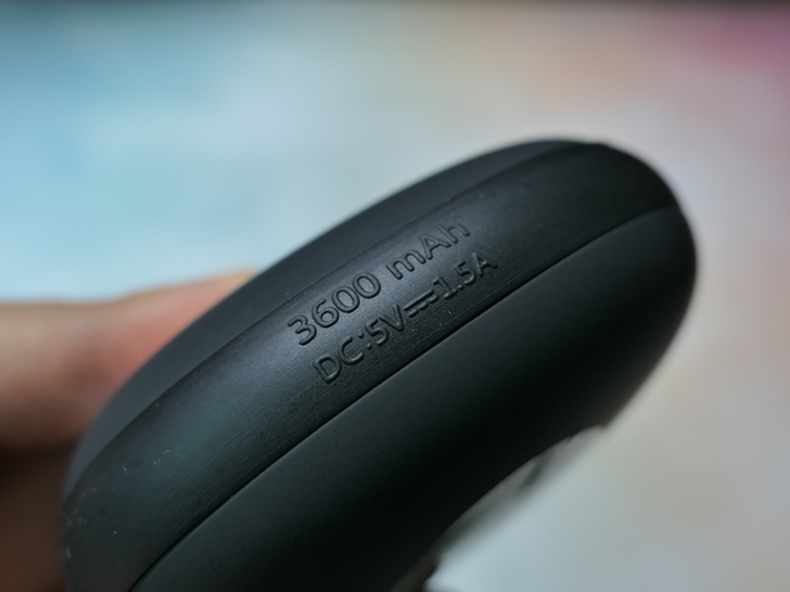 【▼】而底部矽膠處印有此行動電源的容量大小,為3600mAh,充電建議以DC=5V@1.5A來充。