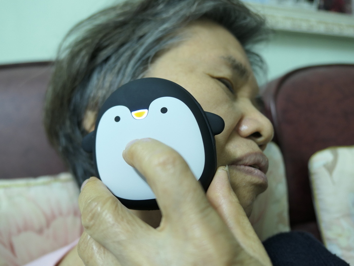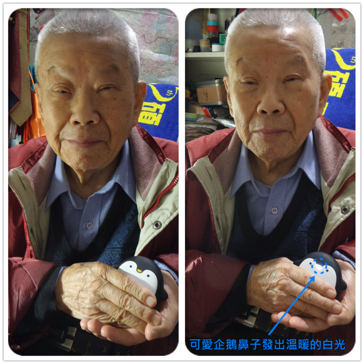 【▼】老媽拿著這可愛的企鵝暖手寶,開機30秒內就能感受到雙面發熱,老媽表示前方白色區域發熱片的有感溫度比黑色來的高些,高差不多約有5度C。