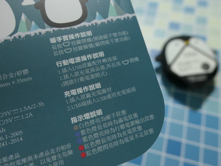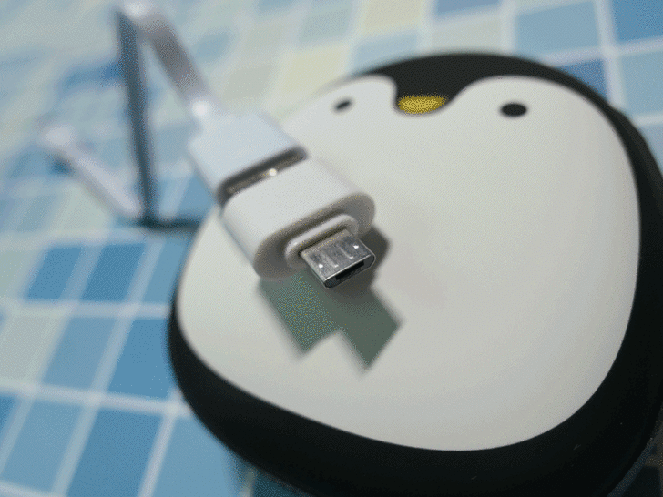 【▼】由於行動電源和暖手寶不能同時使用,所以當行動電源使用時,請先關閉暖手寶,接上欲充電的裝置後再開啟電源,這樣不會進入暖手模式,而且線也有方向,Type-A轉接的microUSB要接到企鵝的頭頂唷,此時藍色燈長亮為滿電狀態,藍色燈呼吸閃爍為充電狀態。