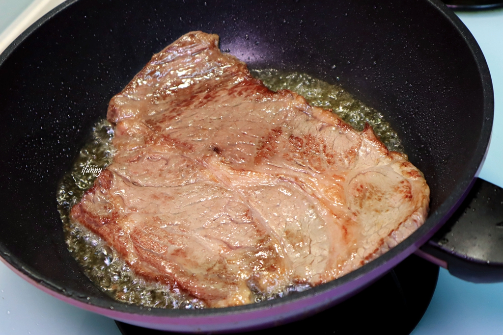 當一面顏色變深後,就可以翻面再煎一下,約莫3~5分熟是我們喜歡的口感。