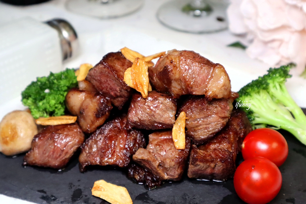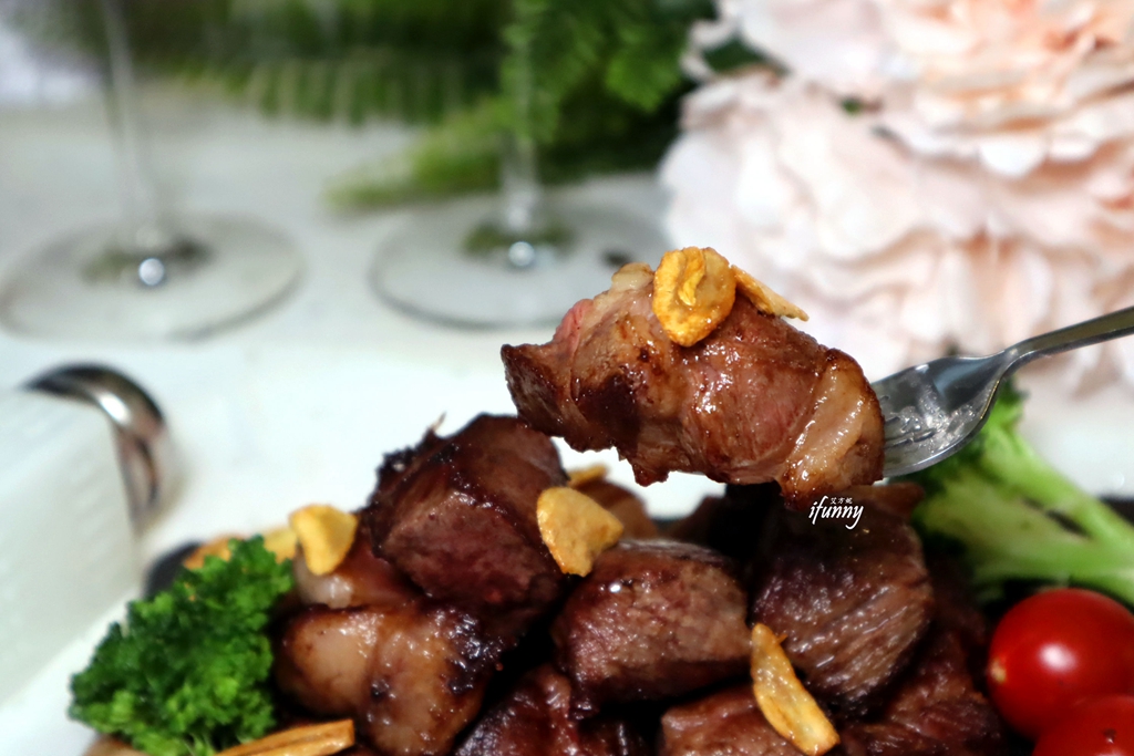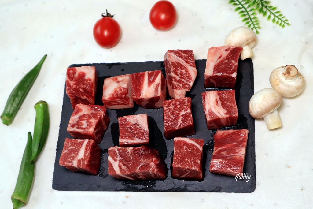 骰子牛的油花也是很美的。而且已經分切成好,其實除了香煎之外,串成肉串來烤,或是來做個紅酒燉牛肉,這都是骰子牛很適合的料理。