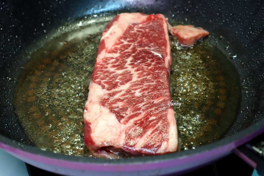 美國牛翼板肉,漂亮的油花分布,跟鍋裡的熱油迸出美味的火花。