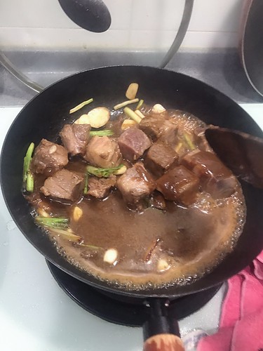 拌炒過一陣子之後覺得牛肉大約3分熟時可以到入剛醃製的醬汁