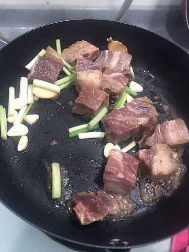 先放入新鮮的蔥段+蒜片炒香之後再丟入牛肉~