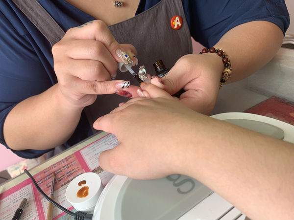 然後因為我大拇指有貼鉚釘,美甲師很細心的用另外的燈先幫我照過