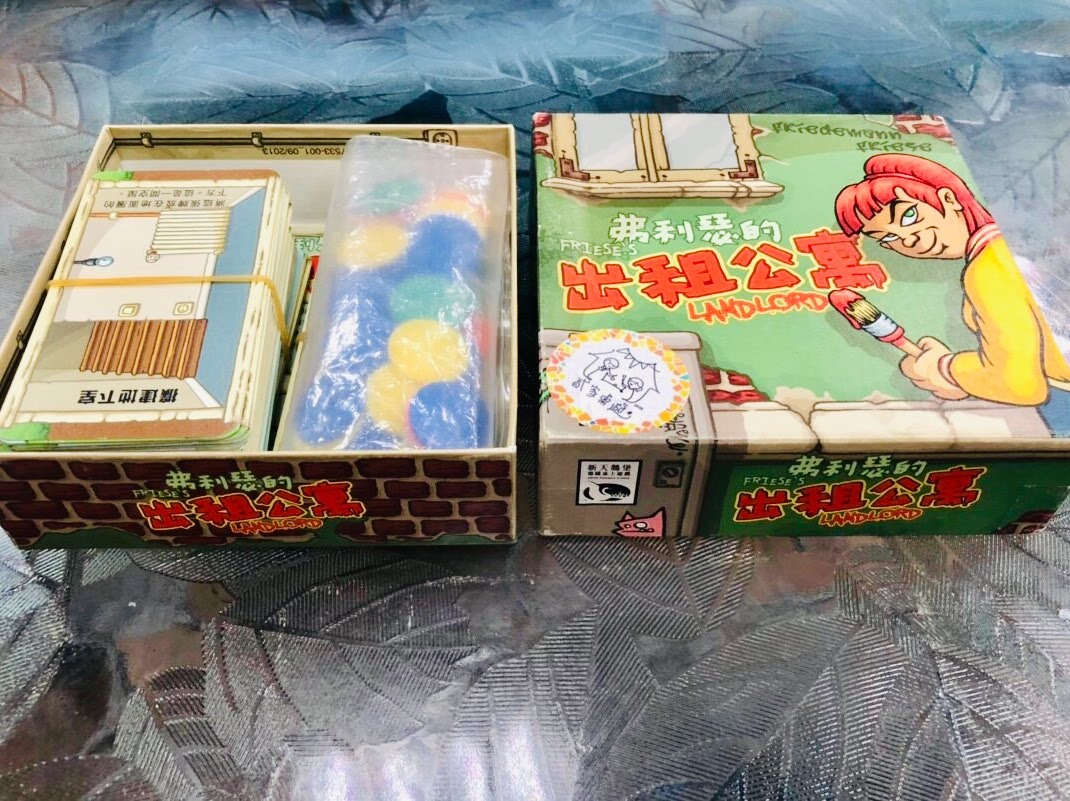 遊戲道具有各種卡牌(房屋、房客、特殊等)及錢幣