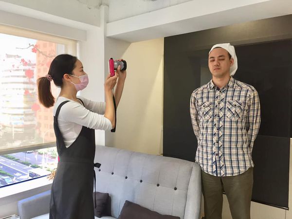 一進包廂就看到羽彤用棉花棒幫Mr.H清理小細節