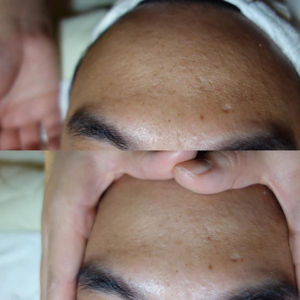 當肌膚吸飽水分後,臉部肌膚的鬆弛度一定會有所提升,就拿Mr.H的額頭做示範