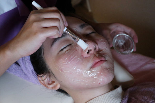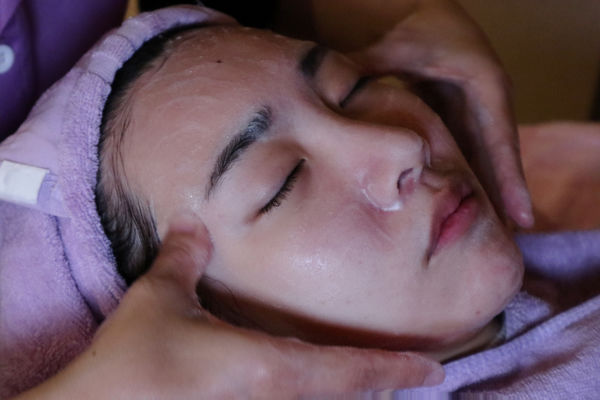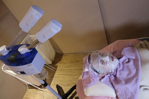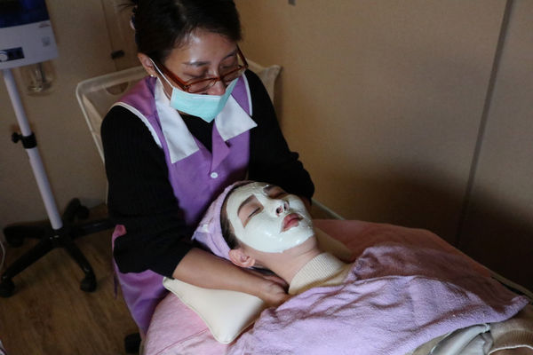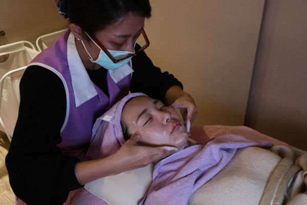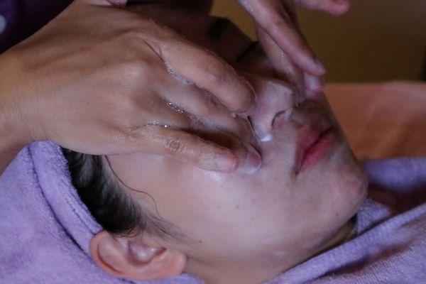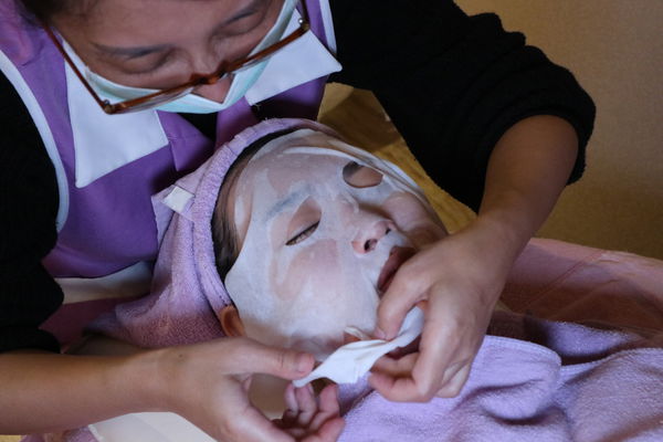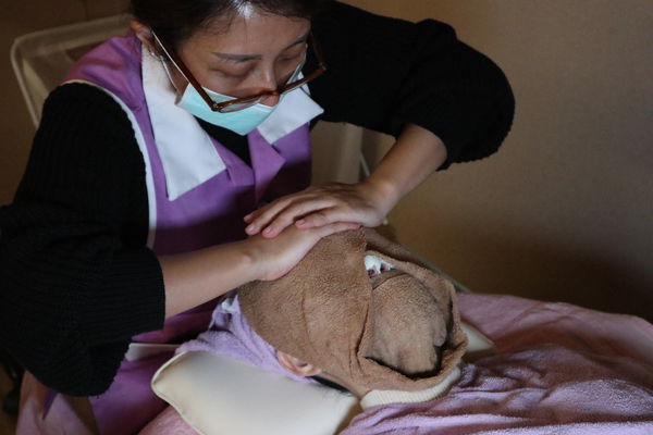 ▲卸除泥面膜前,會包熱毛巾進行臉部的按摩與擦拭。
