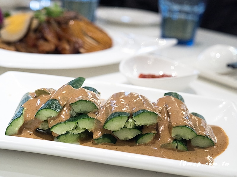 一般牛肉麵店都會賣小黃瓜,天下三絕用了胡麻醬來當醬料,有別以往吃到的醃製口味,