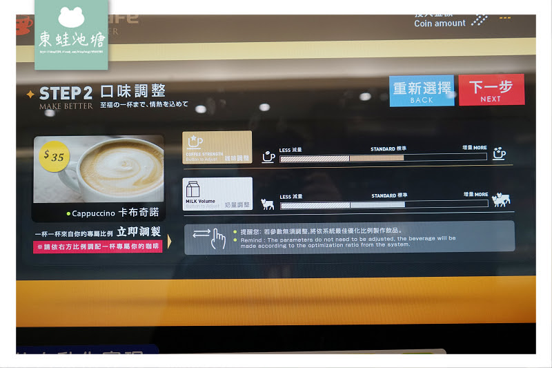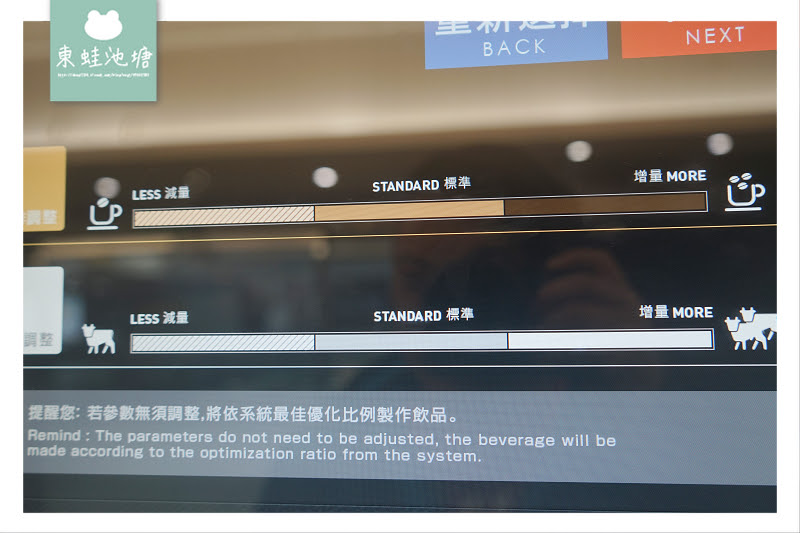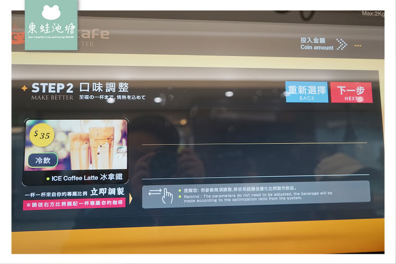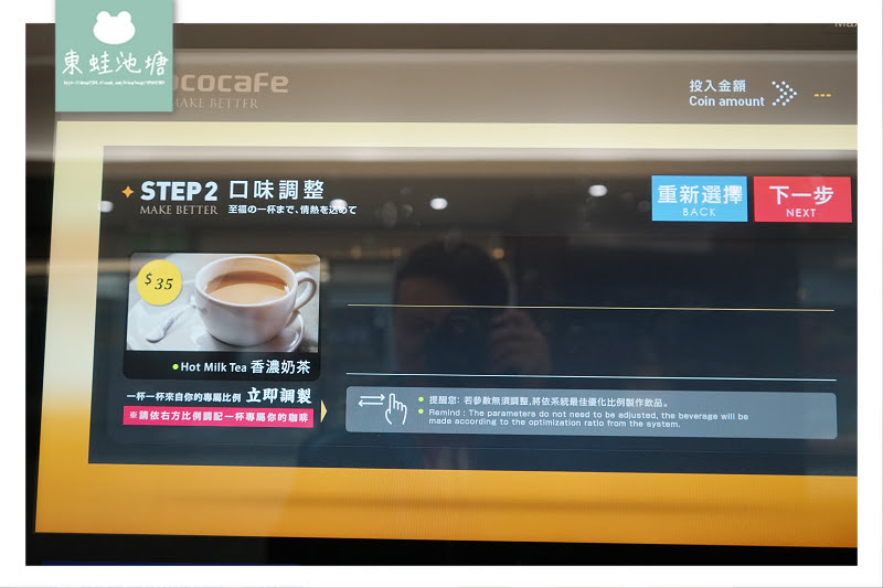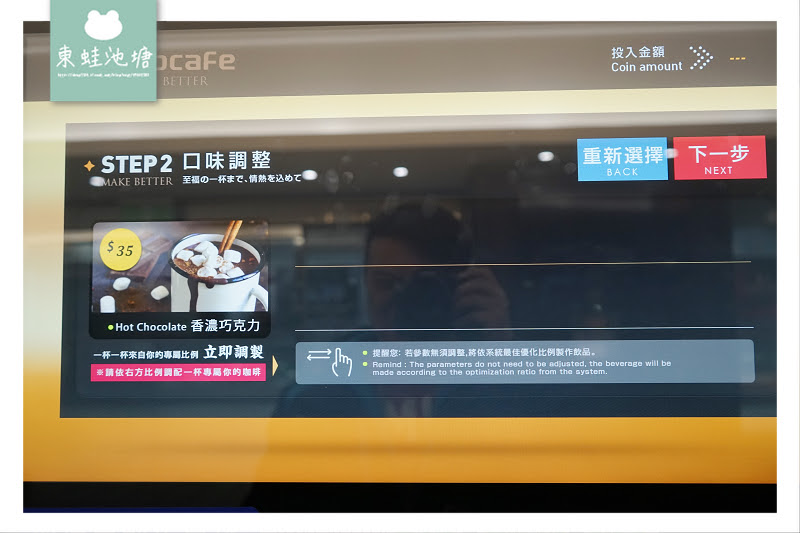 CoCoCafe 無人咖啡機的飲品有些是可以客製化調整比例的,如果沒有的話,點了飲品之後可以直接點下一步
