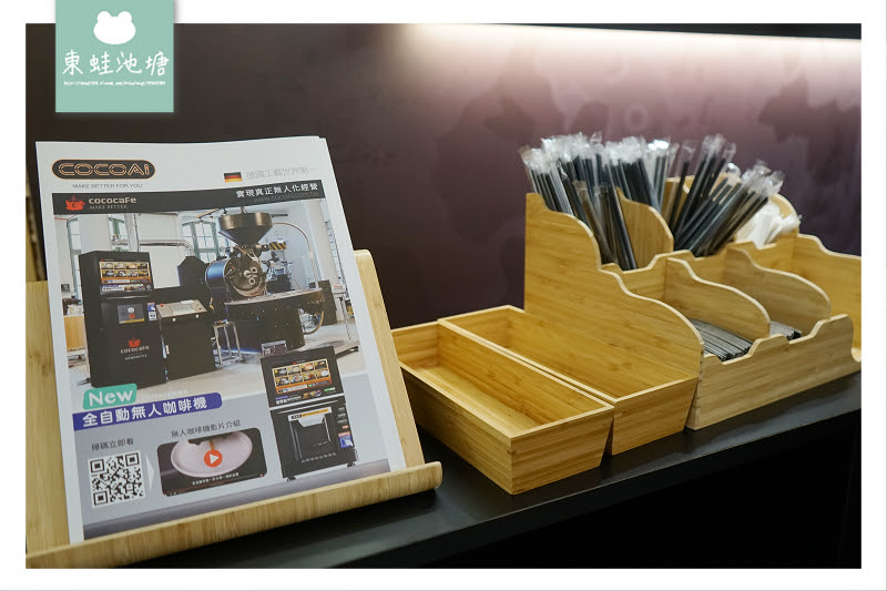 內用自取區,上面有衛生紙、吸管和隔熱杯墊,櫃子上還有 CoCoCafe 的介紹DM,有興趣的朋友可以看看