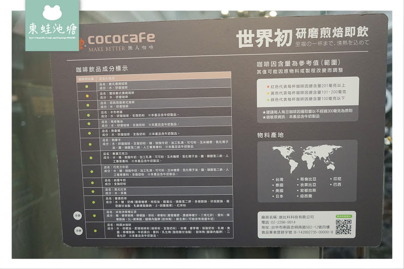 CoCoCafe 的所有飲品的成份表,使用阿拉比卡咖啡豆和紐西蘭奶料