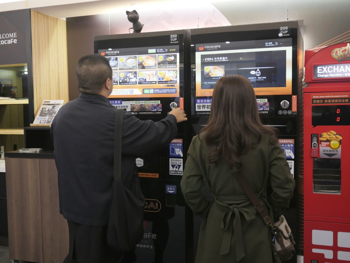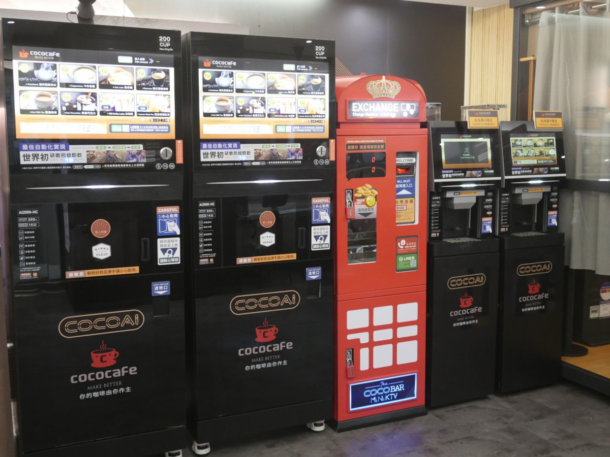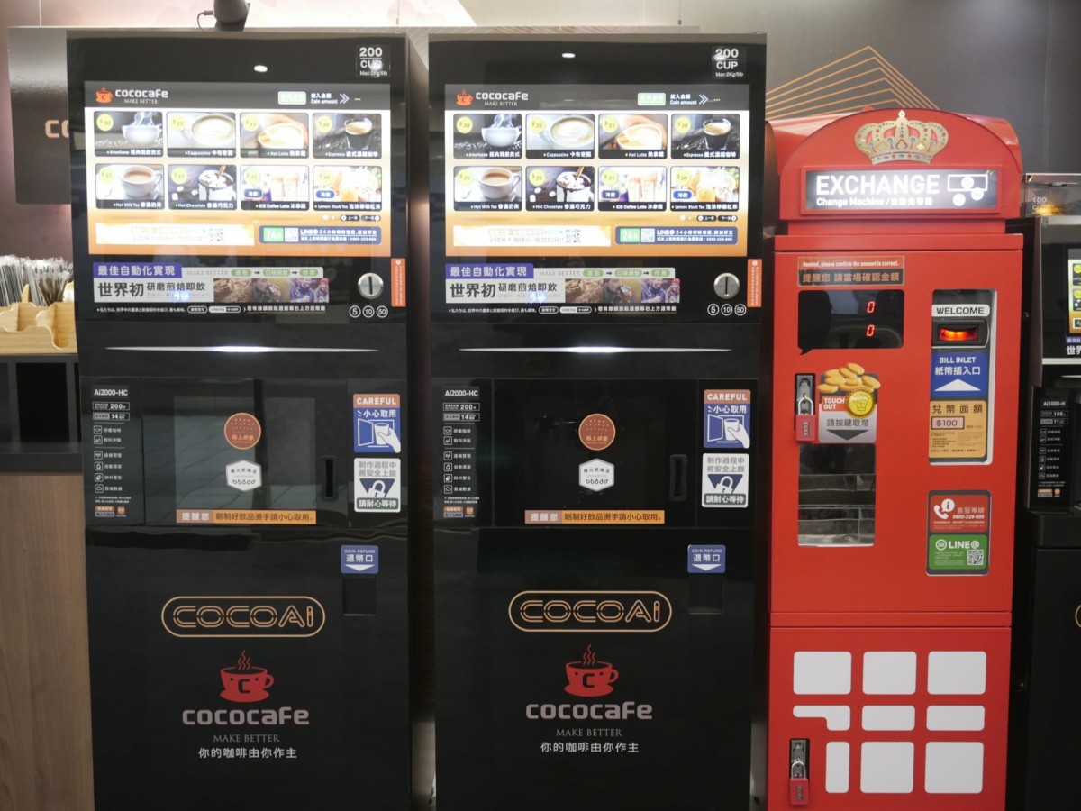 由左至右分別是Ai 2000-HC 大型無人咖啡機, 兌幣機與Ai 1000-H中型無人咖啡機