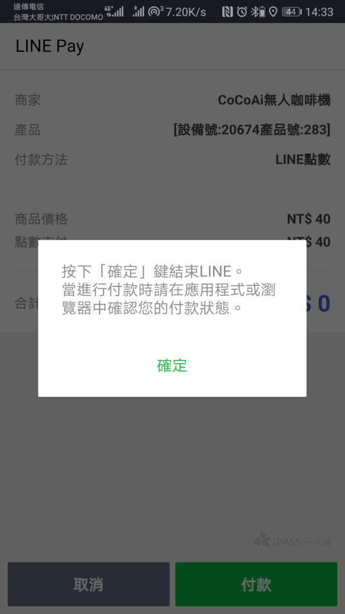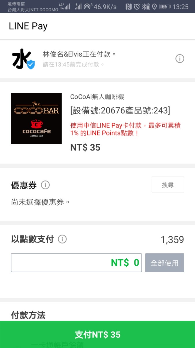 就會出現付款畫面, 目前有現金零錢與Lin Pay兩種付款方式