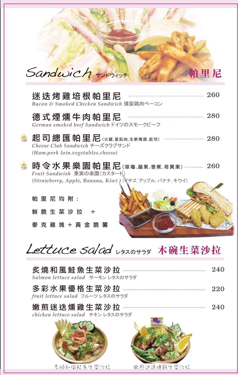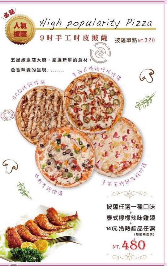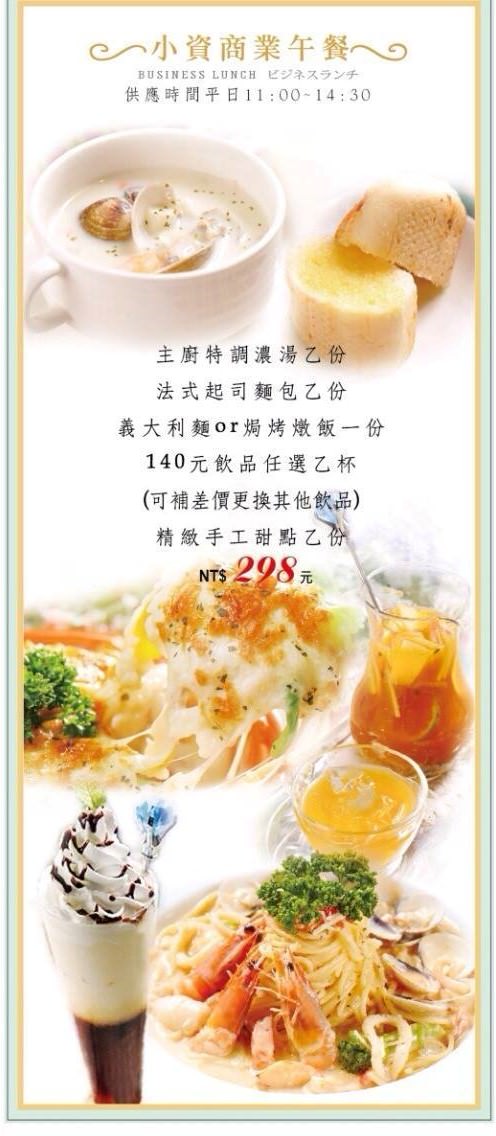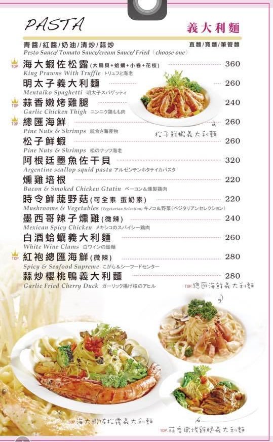 義式料理排餐、義大利麵、焗烤燉飯、精緻燉飯、甜蜜鬆餅、輕食、木碗沙拉、炸物點心、冷熱飲品(義式咖啡、莊園精品咖啡、德國農莊B&G有機花茶、果粒茶)