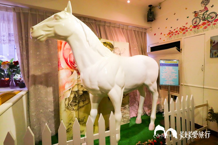 店內以日系鄉村風格為主題,一進門即可看到一隻大白馬,一旁有寫著一個傳說:只要在白馬的鬍鬚由上往下摸三次就能在短時間找到心目中的白馬王子XD