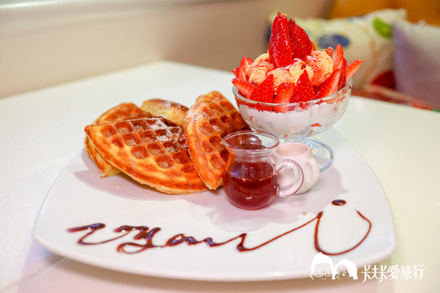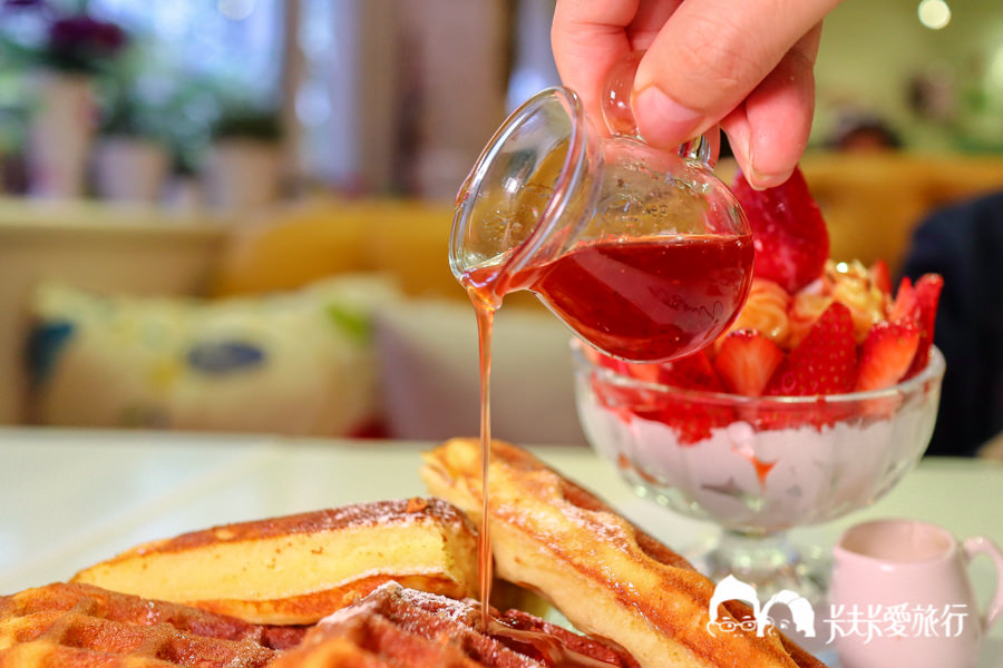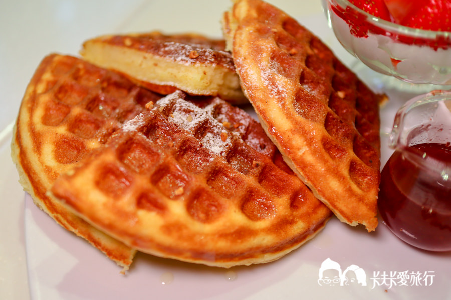 旁邊還有一小杯煉乳及草莓醬可以淋上一起吃,一整份酸甜滋味的鬆餅,讓整個午後都擁有好心情
