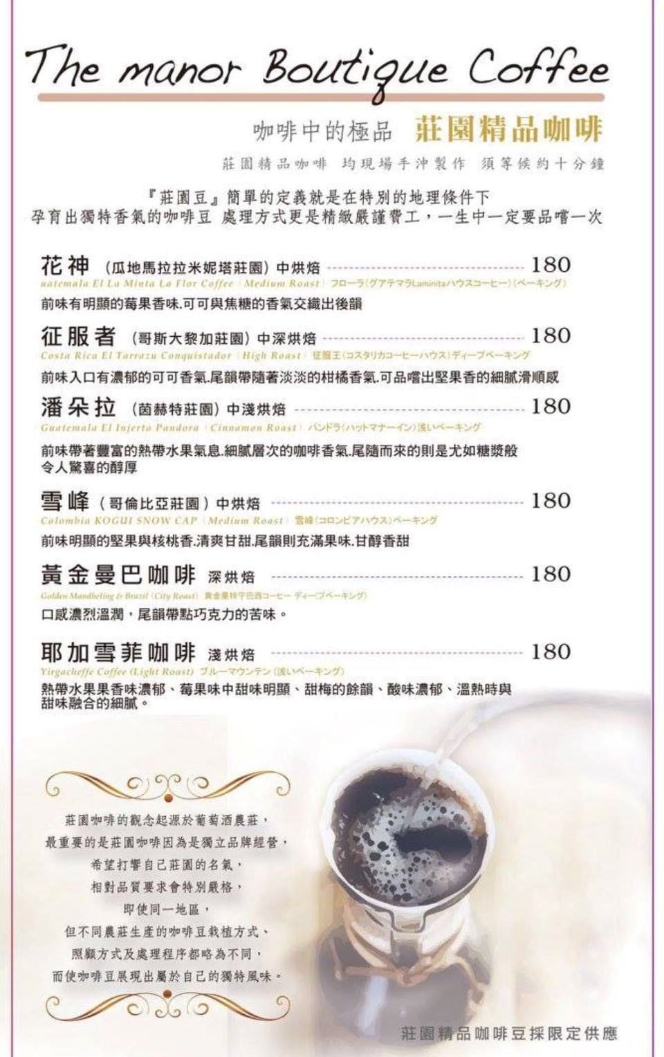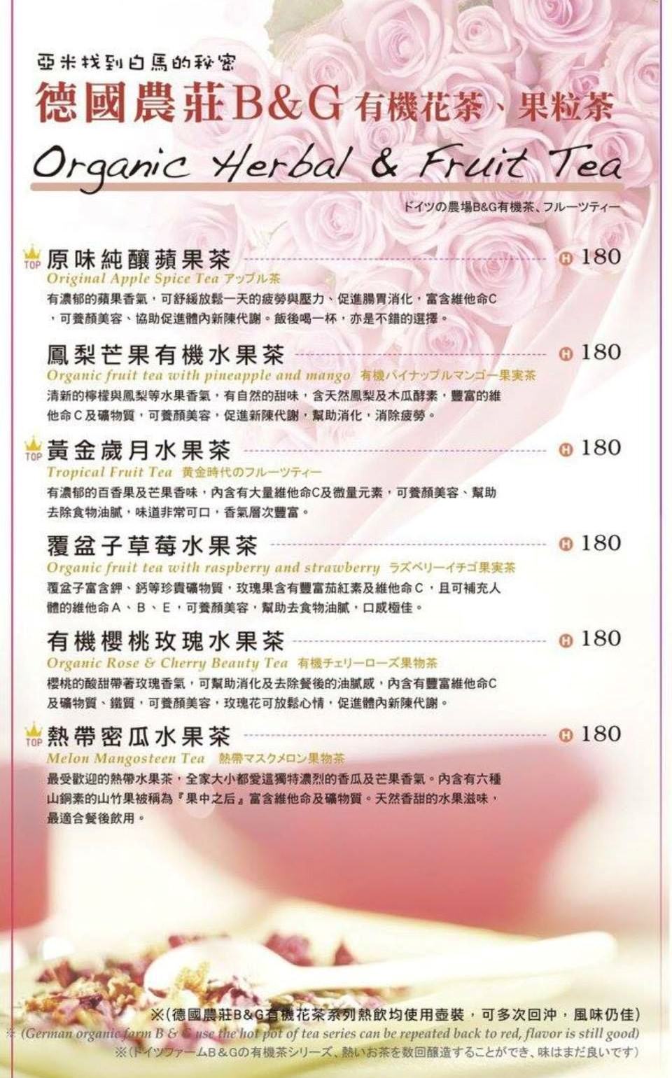 義式咖啡、精品咖啡、德國農莊B&G有機花茶、果粒茶等,套餐可140元冷熱飲品任選(超過補差價)