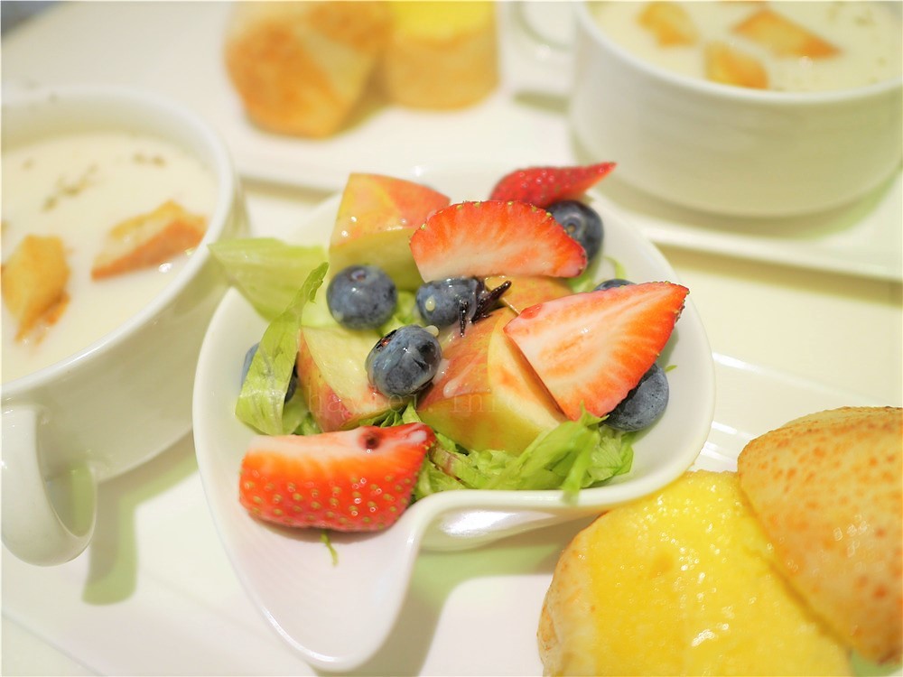 沙拉裡面有著各種鮮果,特別的是還加了一般沙拉少見的草莓、藍莓,看起來特別繽紛