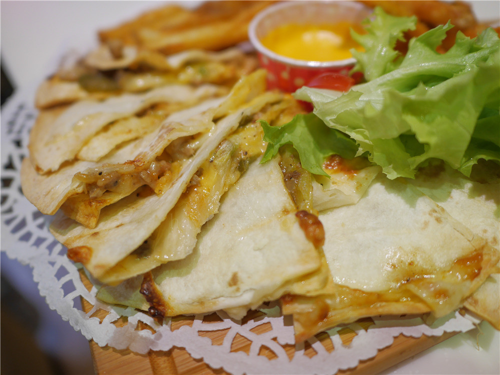 這道起司泡菜烤餅靈感來自墨西哥烤餅,只是墨西哥當然沒有泡菜,所以算是融合國際美食的創意料理。