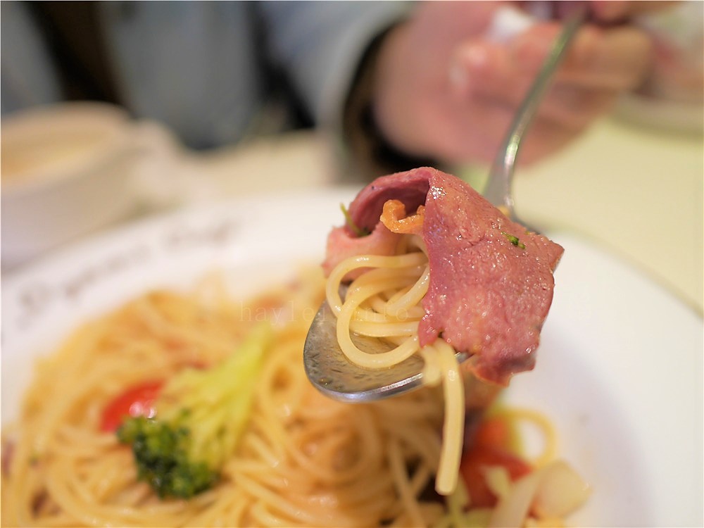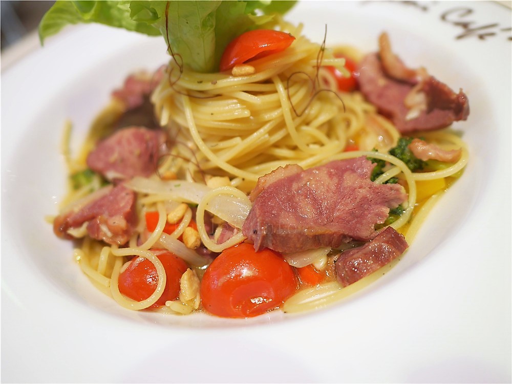 我覺得Oyami cafe的義大利麵真的很有水準,這道蒜炒櫻桃鴨義大利麵吃起來鹹香夠味,連鴨的油脂都融進義大利麵中,味道非常好!