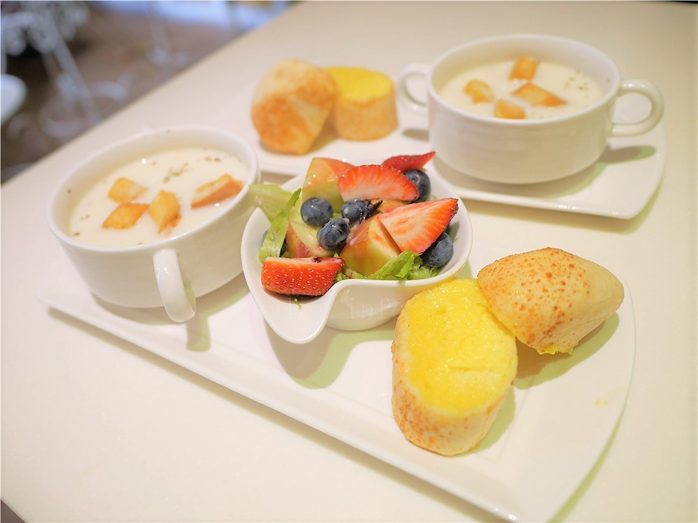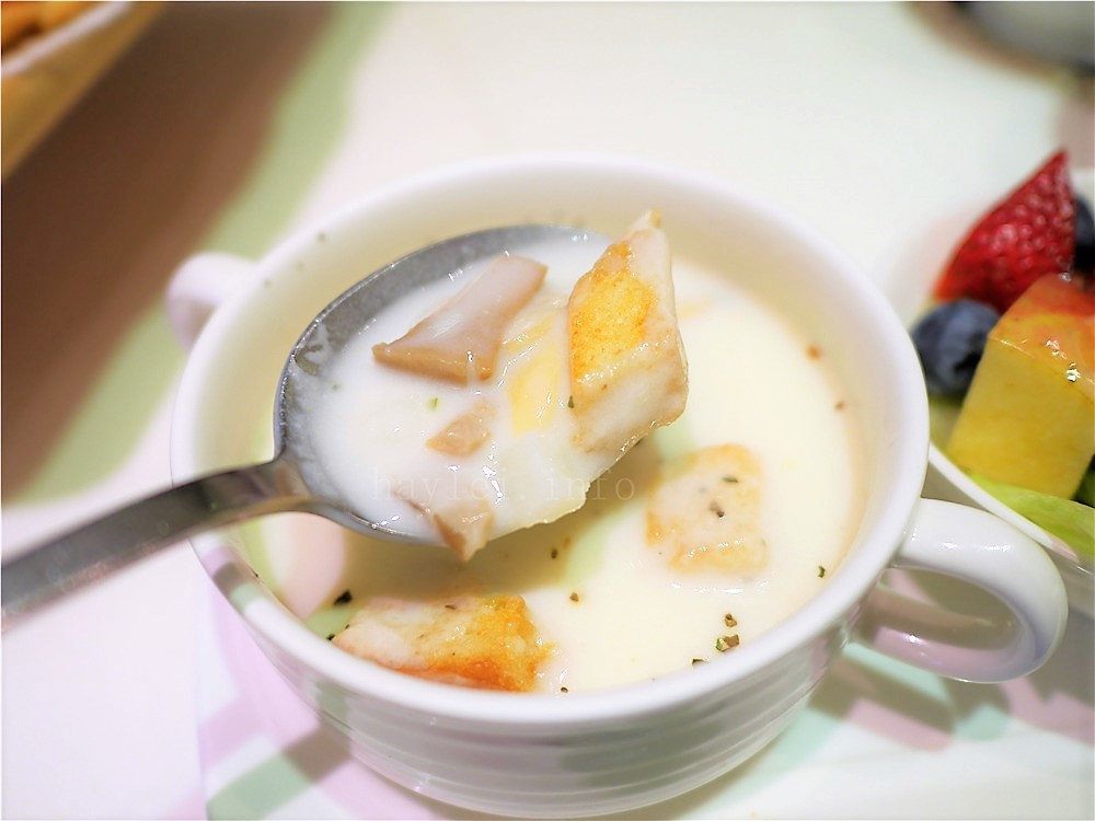 烤過的麵包法式蒜香麵包外酥內軟,入口香氣迷人;主廚濃湯喝起來非常濃郁,裡面有貝類跟馬鈴薯、蘑菇等配料,口感很豐富