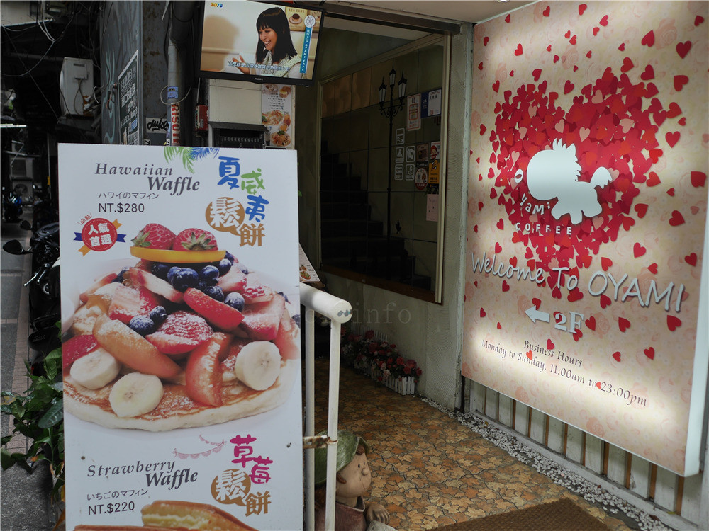 Oyami cafe位於西門町著名的刺青街、服飾街這,位置在二樓,招牌很大,地點其實很好找,離西門町六號出口步行約2分鐘就能到了!