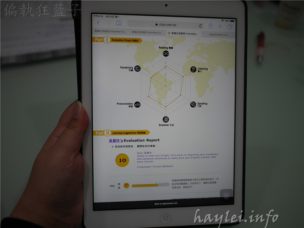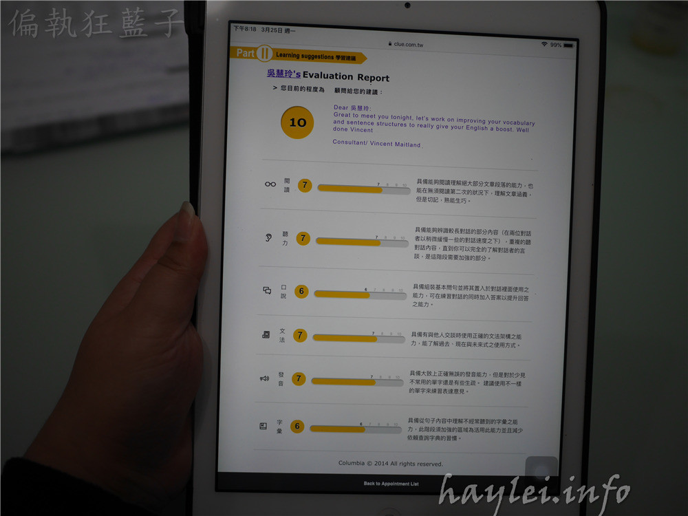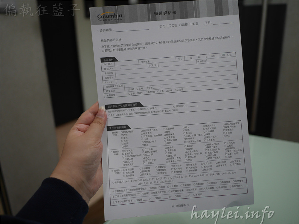 在歌倫比亞美語這裡,開始諮詢前都會填個學習評估表,接著會由專業美語顧問跟你單獨對談,測試你的英文水平在哪個階段@@