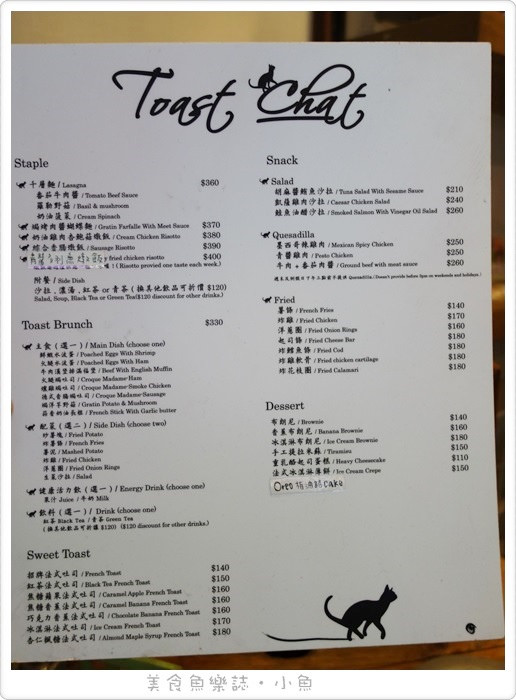 菜單,有千層麵、燉飯、早午餐、吐司、沙拉、炸物、甜點