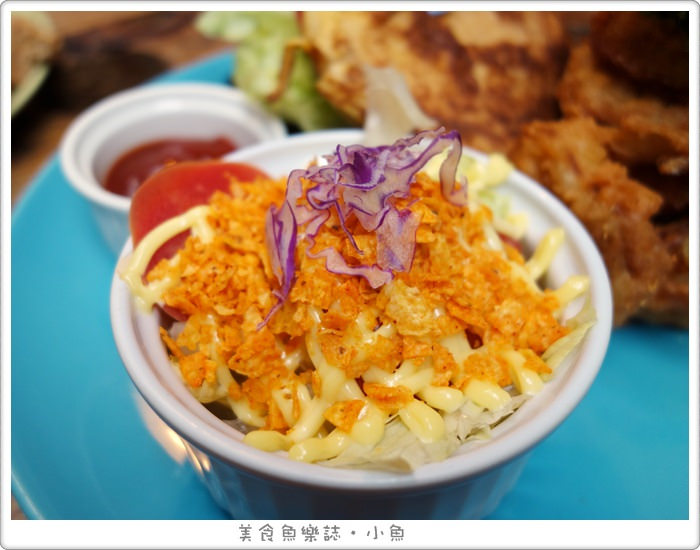 沙拉很豐富,上面撒了多力多滋碎片,酸酸甜甜的特調美乃滋很對味