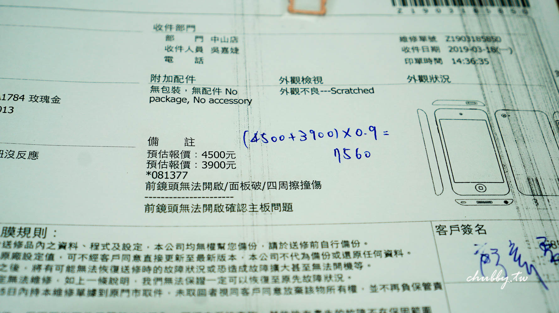 檢查過後,確認病症如下:前鏡頭無法開啟(須確認主機板問題)/面板破/四周擦撞傷 因為主機板的問題比較嚴重,需要留機 3~4 天來仔細檢測抓漏,因此正式維修前,需要簽下維修協議書,裡面大致上就是維修須知,滿好的~保障店家、也保障消費者的權益。