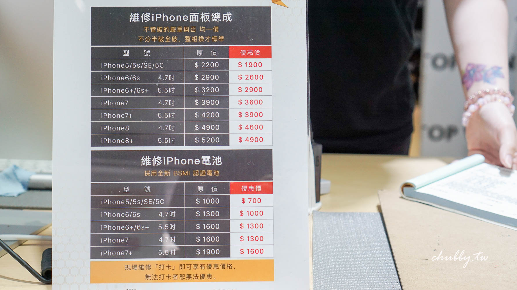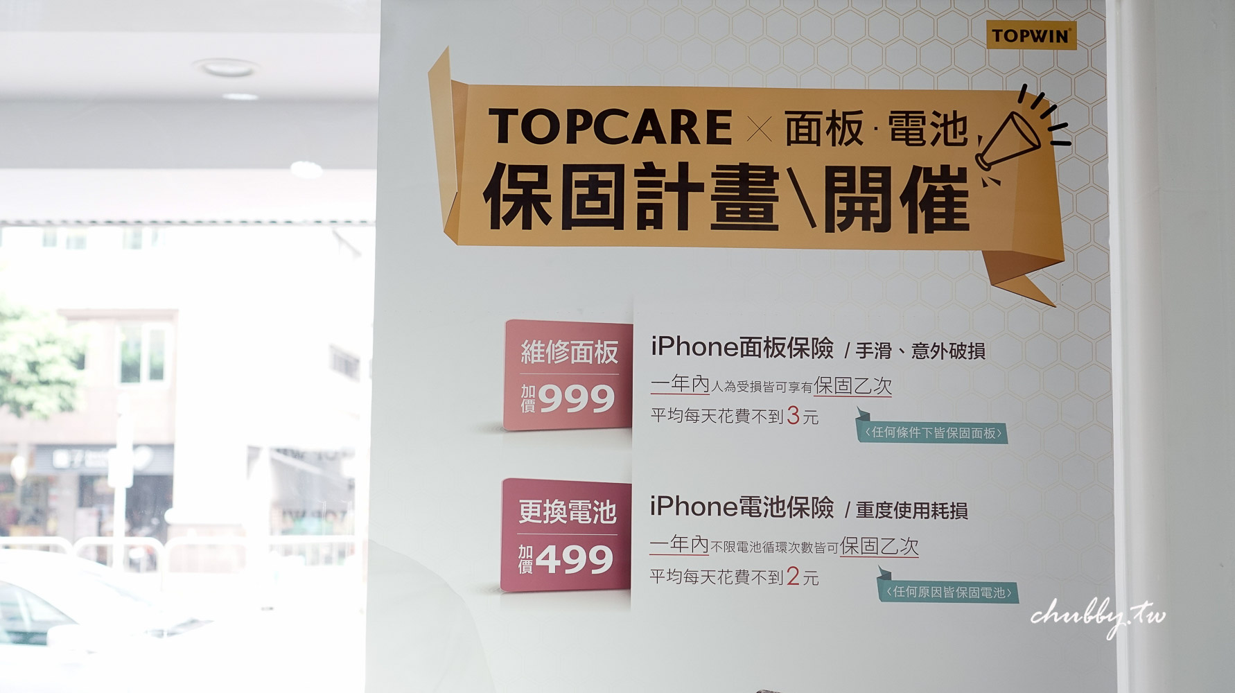 然後這個TOP CARE的保固計畫我覺得大家都可以注意一下: 類似手機維修保險的服務,假設來鼎威科技換螢幕花了 4500 元,當場決定加價 999 元買這個TOP CARE保固,在維修後一年內,只要你手滑螢幕又破掉,可以免費更換一次!這根本是吃到飽的概念! 啊如果你面板沒問題,可以帶手機來換一下老扣扣的電池,加價499元買這個TOP CARE保固一年內不限電池循環次數可以保固一次耶!