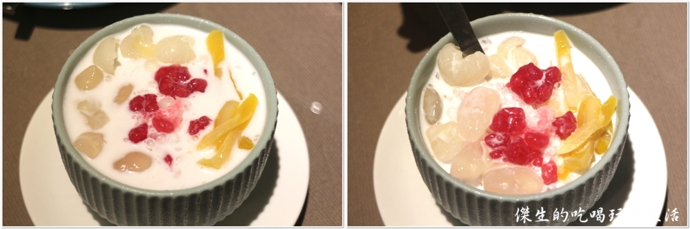 ▲第十道摩摩喳喳~有龍眼.芒果.荸薺.亞達籽在裡面~喝上一碗~整個味覺都療癒了~很滿足~
