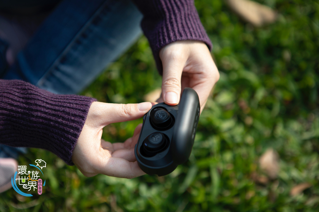 充電中的JLab JBuds Air真無線藍芽耳機,如嬌小的碗豆造型,可愛又萌萌噠!