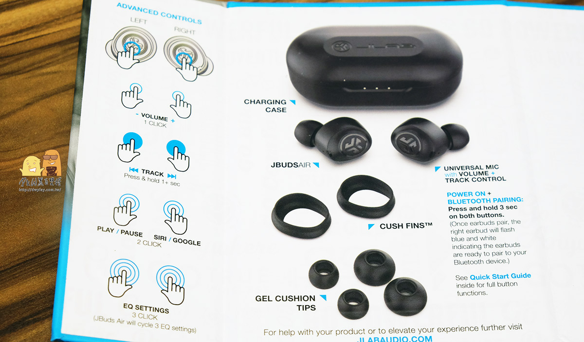 還是有一本說明書以及可提升配戴舒適度的耳內穩定器 (Cush Fins)