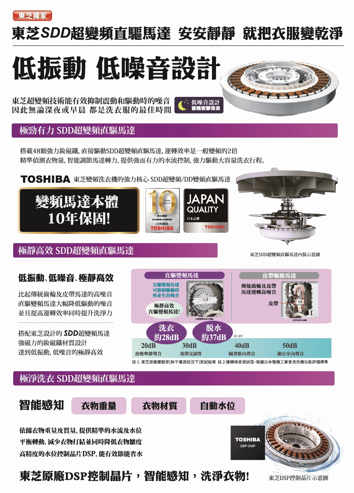除了是日本東芝品質還享有全機1年保固 ,10年直驅變頻馬達本體保固的保証。