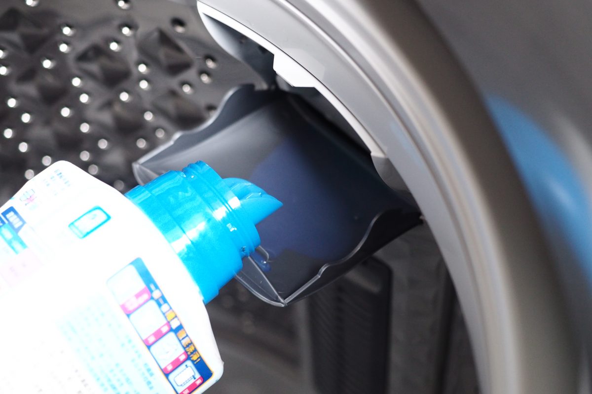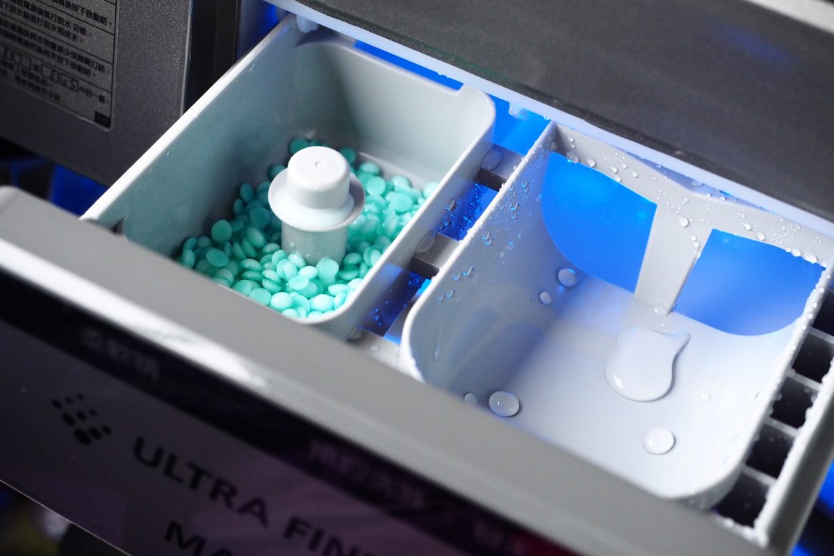 洗衣精事放在側邊的洗滌盒裡面