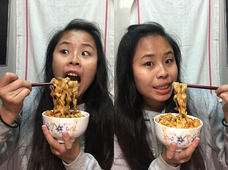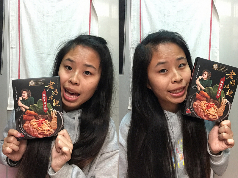 女孩覺得老媽拌麵麻辣火鍋乾麵吃法很有趣,除了乾拌麵外,還有麻辣火鍋湯頭可以搭配,多一碗湯真的很重要XDD