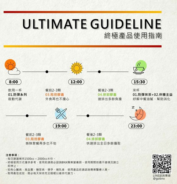 3. DIET PLUS餐後排卸膠囊: 於餐後30分鐘內,搭配開水使用,請同時多補充水分,並參考以下注意事項: