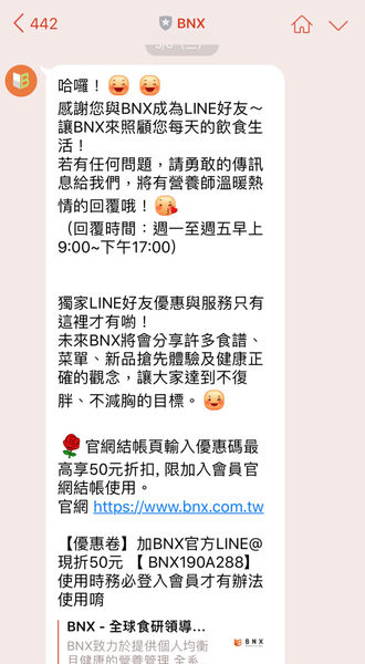 我還加了BNX的 Line 免費飲食習慣的建立,真棒👍🏻,其實好的飲食習慣比任何減肥都棒!