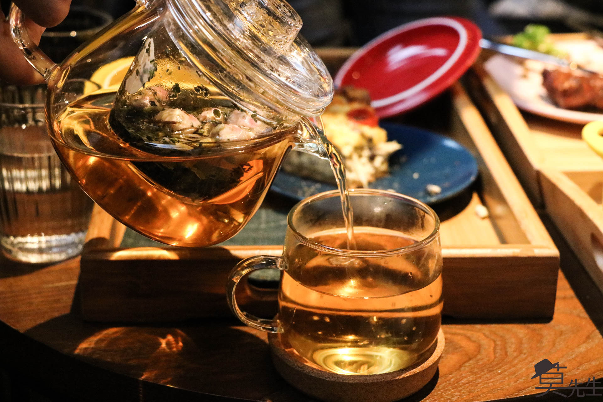 選擇的飲品是舒身四草茶 $120。 以玫瑰花、馬鞭草、茴香、甘草四種天然花草為主軸,佐上薄荷和莓葉,非常適合與口味偏重的餐點搭配,清爽解膩。